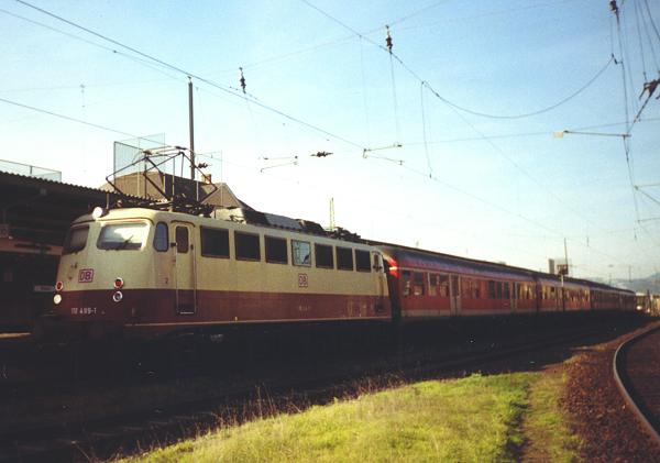 Zum Fahrplanwechsel am 15. Dezember 2002 wird die Zahl der Heimatdienststellen der Baureihe 110 erneut erweitert: Das Werk Freiburg wird 21 mit CIR-ELKE ausgerüsteten Maschinen aus Saarbrücken übernehmen. Die Loks sind derzeit vor allem auf der Relation Basel - Offenburg - Karlsruhe -Mannheim - Saarbrücken zu finden. Neben 20 „Bügelfalten"-110 gehört auch die 1957 gebaute „Kasten"-110 169 dazu, vor Jahren die Prototyp-110 mit LZB. Die im Mai 1998 hauptuntersuchte, verkehrsrote Lok hatte bereits im August 2002 ihren Laufkilometergrenzwert erreicht und wurde daher zur erneuten HU in dasWerk Dessau geschickt. Sie ist bereits die vierte Maschine, die nach dem offiziellen Ende der Untersuchngen an „Kasten"-110 eine Hauptuntersuchung erhielt. Die vor allem im Abschnitt Offenburg - Freiburg -Basel im Jahr 2001 weitgehend von den acht Freiburger 111 mit Doppelstockzügen verdrängten 110 werdenn in Freiburg zukünftig auch einen Teil der 143 ablösen'n, die dann nach Trier abgegeben werden. An „Bügelfalten"-110
